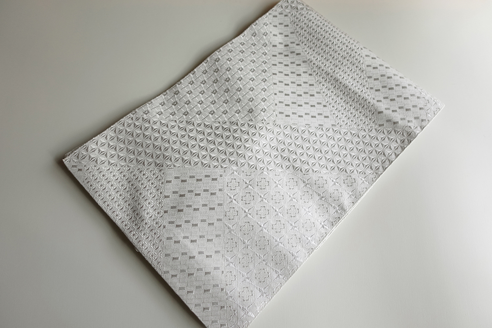 パッチワーク風の豊かな織模様が重ねられたデザインは、
