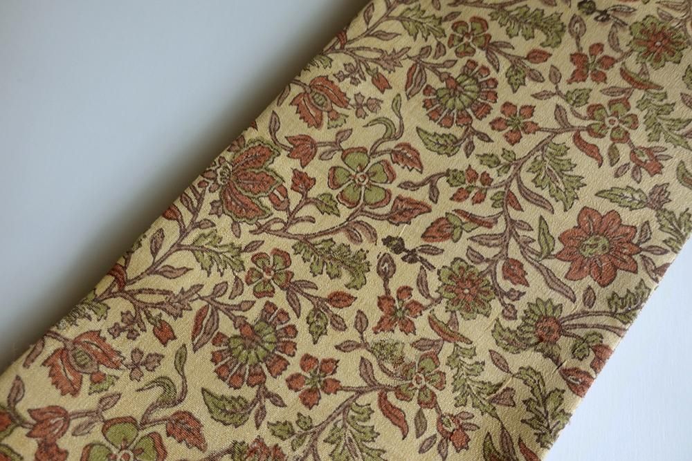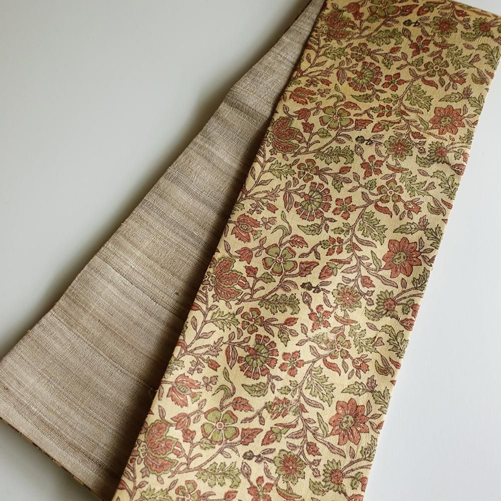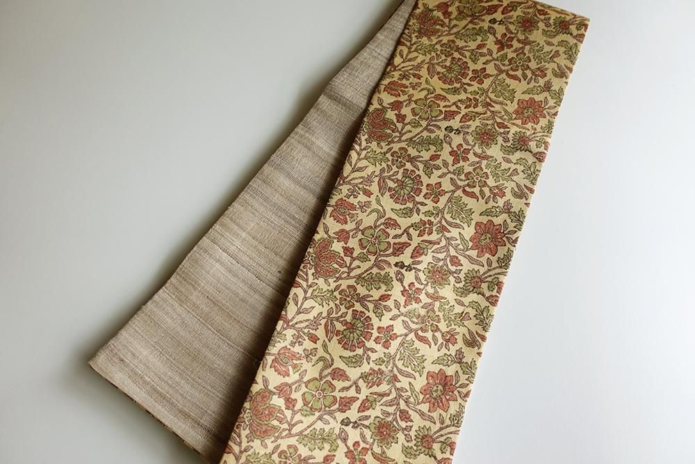 本品は、手織りの布に更紗柄を型で染付をするという昔ながらの技法で染色しています。